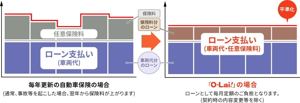 今までの常識は保険契約の等級や事故の有無により、月々のご負担がバラバラでしたが「O-Lai!」ならおまとめできます!!